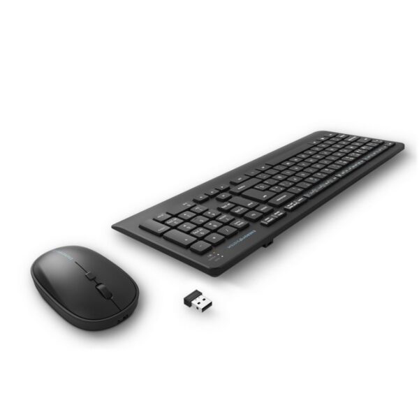 Características | Teclado – Distribución de teclado: QWERTY distribución española – Tecnología: membrana – Nº teclas: 104 – Interfaz: inalámbrica RF 2,4 GHz (hasta 10 metros) – Batería: 3,7 V / 250 mAh – Autonomía: 45 días, aprox – Conector de carga: tipo C – Tiempo de carga: 1 h 30 m Ratón – Tecnología: óptico – Nº de botones: 4 – Rango DPI: 800/1200/1600 – Interfaz: inalámbrica RF 2,4 GHz (hasta 10 metros) – Batería: 3,7 V / 500 mAh – Autonomía: 20 días, aprox – Conector de carga: tipo C – Tiempo de carga: 2 h 30 m, aprox La autonomía puede variar en función del uso diario.+ OTROS – Disponen de interruptores para su encendido/apagado – Teclado resistente a derrames de líquido Compatibilidad – Windows PC/MAC Dimensiones y peso – Teclado: 428 x 158 x 22 mm y 502 g – Ratón: 110 x 63 x 32 mm y 74 g |