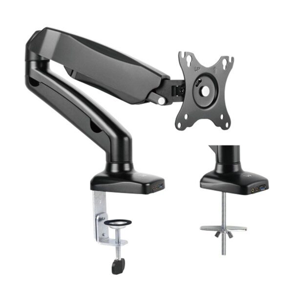| Características | – Material: aluminio, acero, plástico – Acabado de la superficie: recubrimiento en polvo – De color negro – Dimensiones An x Alt x Prof: 117 x 610 x 370mm – Instalación: Abrazadera, montaje en escritorio – Tamaño de pantalla sugerido: 27″-34″ – Adecuado para: 1 pantalla – Pantalla plana de carga máxima: 9 kg – Pantalla curva máxima: 7kg – VESA: 100 x 100, 75 x 75 – Puntos de pivote: 3 – Inclinación: + 90 ° ~ -45 ° – Giratorio: 360 ° – Girar: 360 ° – Brazo Extendido: 450 mm – Altura: 475 mm – Grueso de la abrazadera: 10mm – 85mm – Altura regulable libremente: sí (resorte de gas) – Gestión de cables – Puerto de extensión USB: 1 USB 3.1 gen 1 (longitud del cable: 180 cm) – AWG USB: 28/28 / 24AWG – Puertos de extensión de audio: 1x micrófono, 1x auriculares (longitud del cable: 180 cm) |
