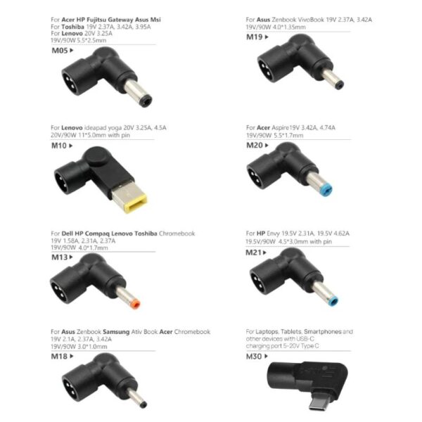 Gracias a sus 8 clavijas DC y su potencia de 65W, es compatible con las principales marcas de portátil actuales: Toshiba, Lenovo, ASUS, HP, Samsung, Acer… y gracias a su clavija USB tipo C, es compatible con la mayoría de tablets, móviles y otros dispositivos con puerto de carga tipo C.