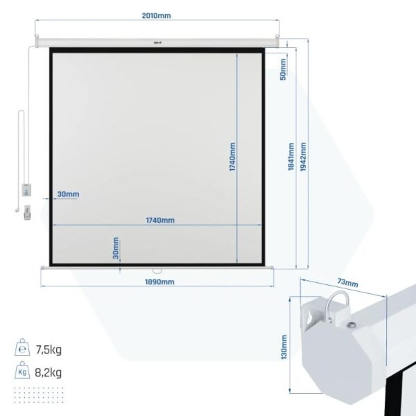 Otras características | – Color: blanco y negro Dimensiones y peso – Medidas panel: 1800 x 1800 mm – Medidas cajetín (cm): 201 (largo) x 13 (alto) x 7,3 (profundo) – Medida barra inferior: 189 cm – Peso bruto: 8,2 kg – Peso neto: 7,5 kg Contenido – Pantalla para proyección 180 x 180 cm – Control de pared – Mando remoto infrarrojo (IR) – Hoja de instrucciones |