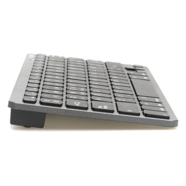 Características | – Teclado Bluetooth 3.0 con 2 canales independientes – Permite alternar entre dos dispositivos Bluetooth – 78 teclas (teclado 60%) – Ultra-silencioso – Diseño delgado – Agradable al tacto – Soporta Windows, macOS, Android – 2 pilas alcalinas AAA 1,5V (no incluidas) – Colores: teclas negras y base gris |