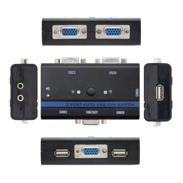 Este KVM switch es un dispositivo que puede controlar dos ordenadores con un solo teclado, ratón, monitor y altavoces.