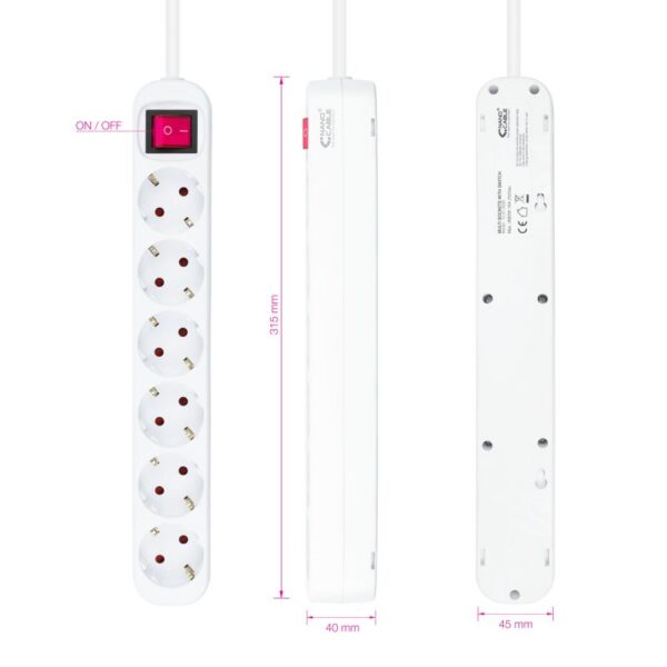 – 6 tomas de corriente con toma de tierra – Protección infantil – Voltaje: 250V-50Hz – Máximo 3.680W – Certificado CE, ROSH, GS y REACH – Color: Blanco – Medidas del producto: 315x40x45 mm