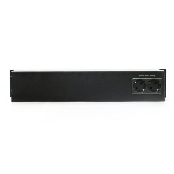 Salida | – Tensión nominal: 230 V – Precisión tensión (modo batería): ±7% – Forma de onda (modo batería): Pseudosenoidal – Frecuencia: 50 / 60 Hz (misma que la entrada) – Precisión frecuencia (modo batería): ±1Hz – Tiempo de transferencia: 4 ms, Máx. 14 ms – Compatibilidad cargas APFC – Sobrecargas admisibles Modo batería: 110 %, corte de voltaje de salida después de 10 segundos; >120 %, corte inmediato de voltaje de salida – Sobrecargas admisibles Modo en línea: 100 %, solo alarma; >130 %, corte inmediato de voltaje de salida – Tipo de tomas: Schuko |