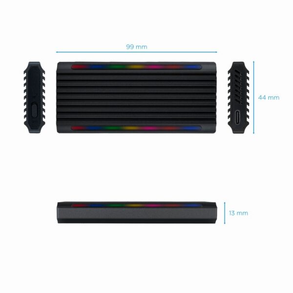– Conexión USB-A (USB 3.1 Gen2 10Gbps) – Apertura fácil, sin tornillos – Compatible con M.2 NGFF y NVMe PCIe 2230/2242/2260/2280 – Soporta SSD de hasta 2 TB – Compatible con Windows, MacOS y distribuciones Linux – Incluye cable USB-A a USB-C – LED´s RGB – Material: Aluminio – Peso neto: 0,064 kg. Peso bruto: 0,137 kg – Medidas del producto: 99x44x13 mm Contenido – 1 x Caja externa – 1 x Cable conexión – 1 x Pieza de sujeción – 1 x Manual de usuario