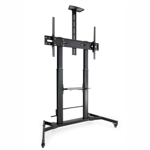 Características | – Pantallas soportadas: 60"-100" – Compatible con VESA: Máximo 1000×600. Mínimo 200×200 – Peso máximo soportado de pantalla: 100 kg – Ángulo de inclinación: +5°/-10° – Regulación de altura telescópica con manivela – Bandeja para reproductor/DVD y bandeja superior regulable para webcam – Rango de ajuste de altura del soporte: 1335-1635 mm – Altura máxima con bandeja superior: 2300 mm – Medida de bandejas: Inferior 430×335 mm. Superior 285×150 mm – Distancia entre ruedas: 1350×683 mm – Ruedas con sistema de bloqueo – Color: Negro – Peso neto: 36 kg. Peso bruto: 40,10 kg – Medidas del embalaje: 1176x446x345 mm Contenido – 1 x Soporte con dos bandejas – 1 x Kit montaje (incluye herramientas) – 1 x Manual de instalación |