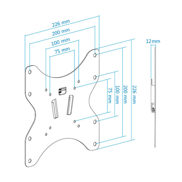 – Pantallas soportadas: 23″- 42″ – Compatible con VESA: 75×75, 100×100, 200×100 y 200×200 – Peso máximo soportado de pantalla: 35 kg – Distancia de pared: 12 mm – Color: Negro – Peso neto: 0,73 Kg. Peso bruto: 1,02 kg – Medidas del embalaje: 235x235x30 mm Contenido – 1 x Soporte – 1 x Manual de instalación