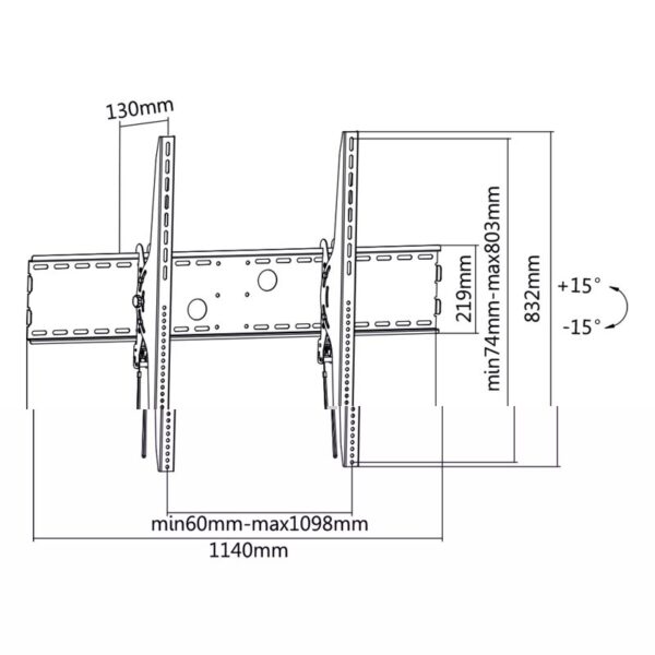 Caracteristicas | – Soporte de pared para pantalla (monitor / plasma / LCD / LED) 60″ – 100″ – VESA compatibles: 200 x 200, 300 x 300, 400 x 200, 400 x 400, 600 x 400, 800 x 400, 800 x 600, 1000 x 400, 1000 x 600 y 1000 x 800 mm – Carga Máxima: 130 kg – Ángulo de Inclinación: -15° / +15° – Distancia de la pared: 130 mm – Color: Negro Contenido del Paquete – 1 x Soporte – 1 x Kit montaje (No incluye herramientas) – 1 x Manual de instalación |