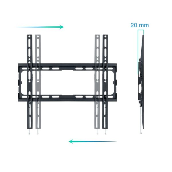 | Características | – Pantallas soportadas: 32"-70" – Compatible con VESA: 75×75, 100×100, 100×150, 100×200, 150×100, 150×150, 200×100, 200×200, 200×300, 300×200, 200×400, 300×400, 300×300, 400×200, 400×300, 400×400 – Peso máximo soportado de pantalla: 45 kg – Distancia de pared: 20 mm – Color: Negro – Peso neto: 0,80 kg. Peso bruto: 0,90 kg – Medidas del embalaje: 450x175x28 mm Contenido del Paquete – 1 x Soporte – 1 x Kit montaje (no incluye herramientas) |